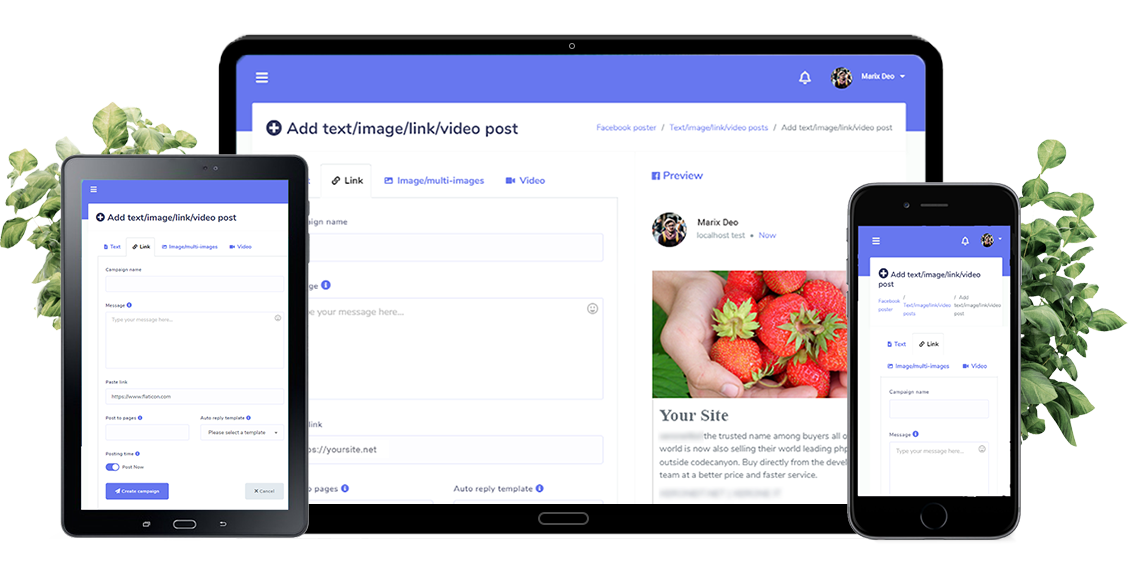 You can post text,image,link,video or carousel/video to your Facebook pages & groups.